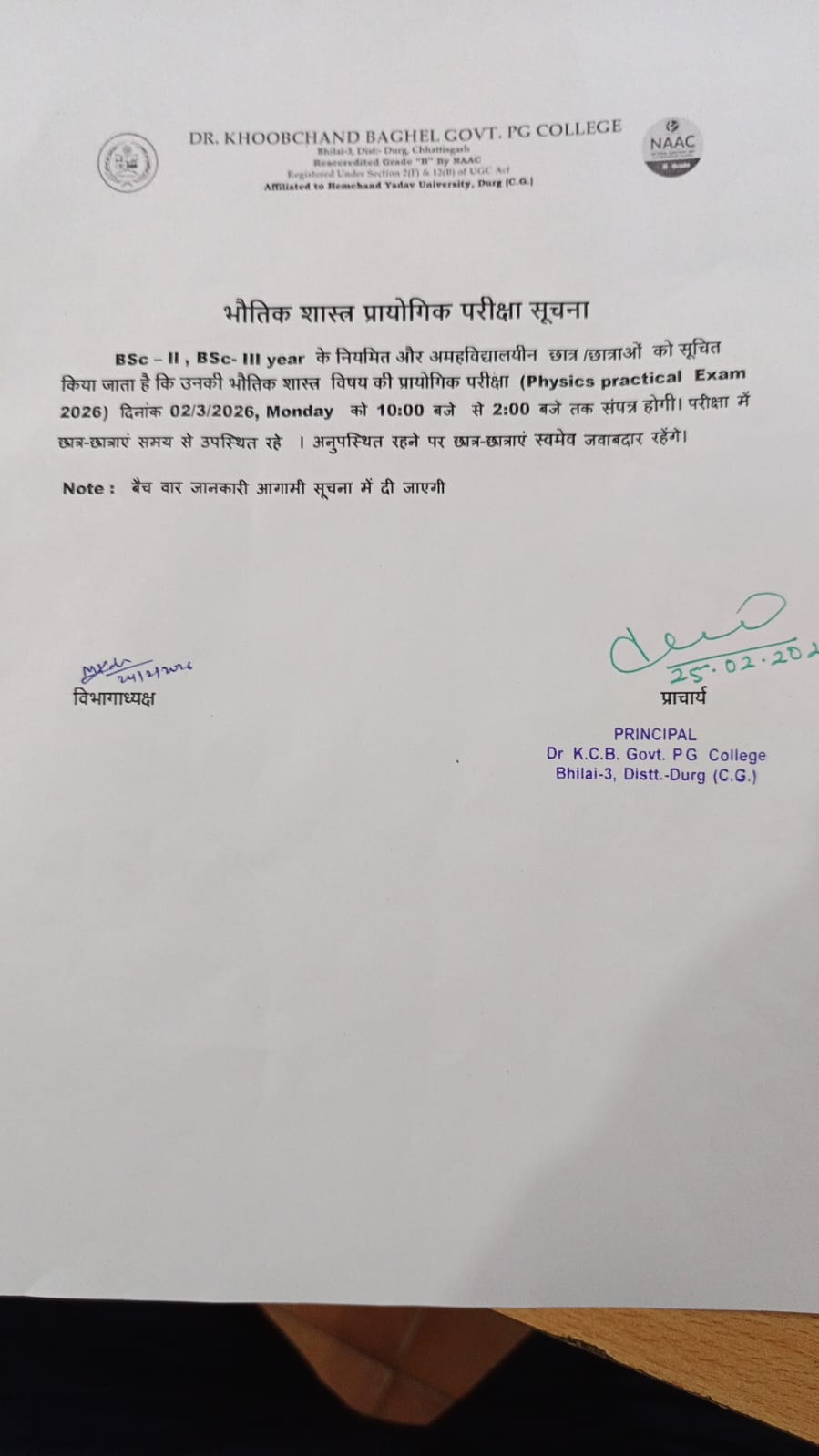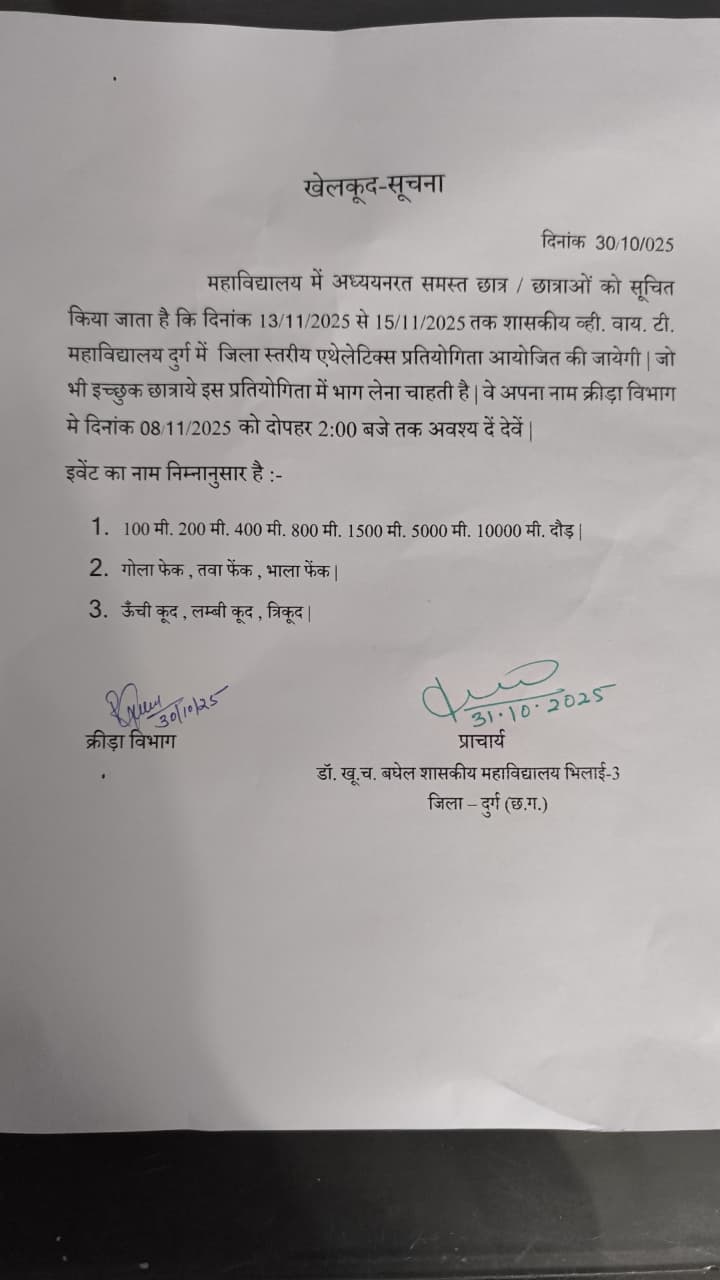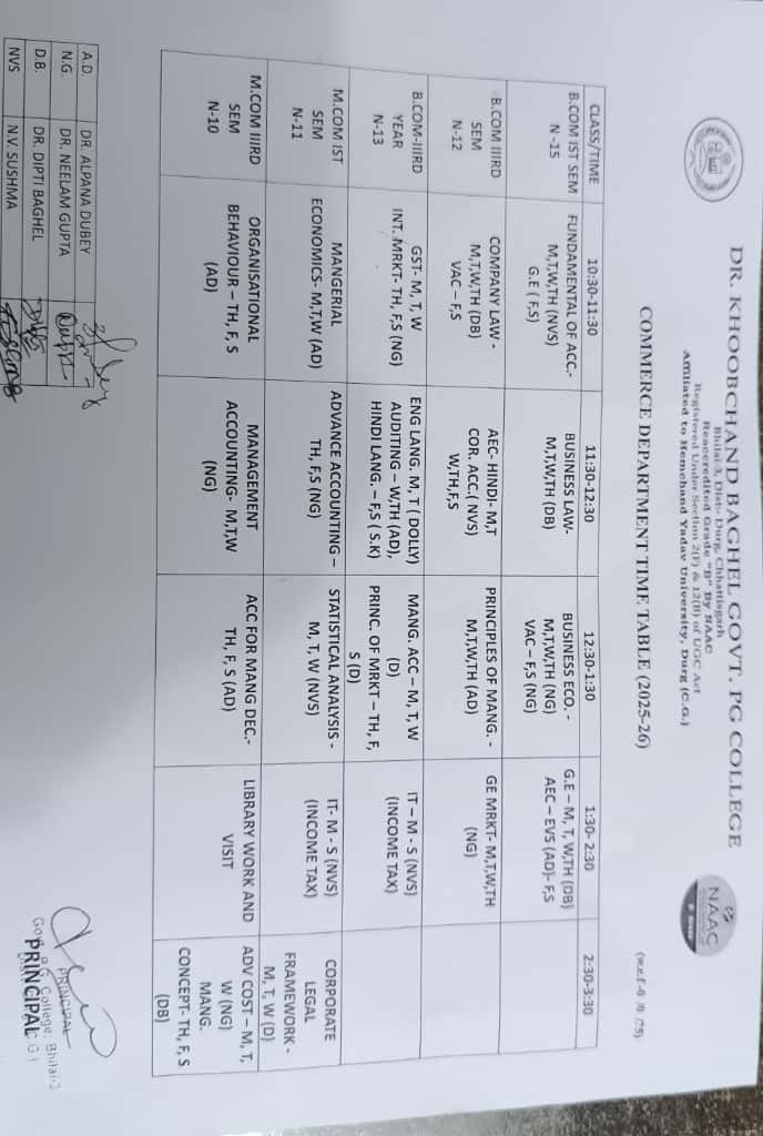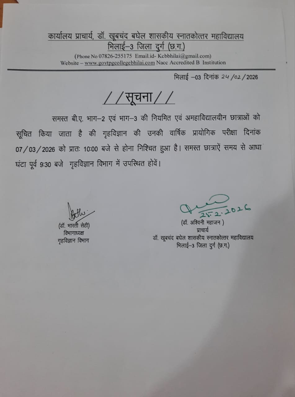Spread over an expanse of almost 13 acres and in close proximity to the National Highway, Dr. Khubchand Baghel Govt. P.G.College Bhilai-3 have an enviable location. It is situated almost halfway between the district headquarters and the Hemchand Yadav Vishwavidyalaya, Durg, to which it is affiliated. Established on 15th August 1983, in the modest campus of the Municipal School at Bhilai-3, it was soon to possess a building of its own. The Foundation stone of this new building was laid jointly by the then Chief Minister of M.P., Shri Arjun Singh and the Education Minister Shri Motilal Vora on 16 Feb. 1984. The building was inaugurated by Shri Motilal Vora the Chief Minister of M.P. on 23 October 1985.