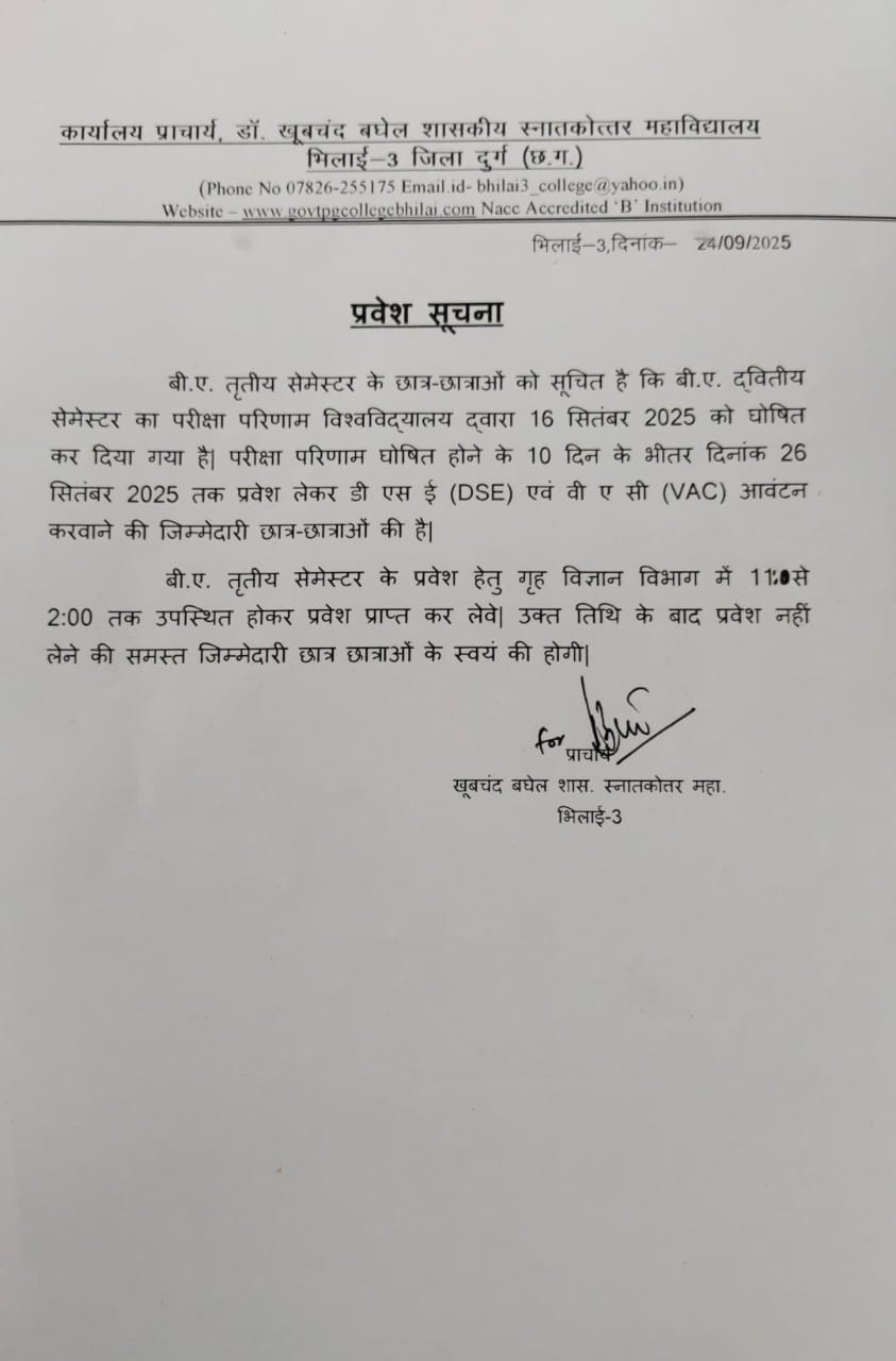 Spread over an expanse of almost 13 acres and in close proximity to the National Highway, Dr. Khubchand Baghel Govt. P.G.College Bhilai-3 have an enviable location. It is situated almost halfway between the district headquarters and the Hemchand Yadav Vishwavidyalaya, Durg, to which it is affiliated. Established on 15th August 1983, in the modest campus of the Municipal School at Bhilai-3, it was soon to possess a building of its own. The Foundation stone of this new building was laid jointly by the then Chief Minister of M.P., Shri Arjun Singh and the Education Minister Shri Motilal Vora on 16 Feb. 1984. The building was inaugurated by Shri Motilal Vora the Chief Minister of M.P. on 23 October 1985.